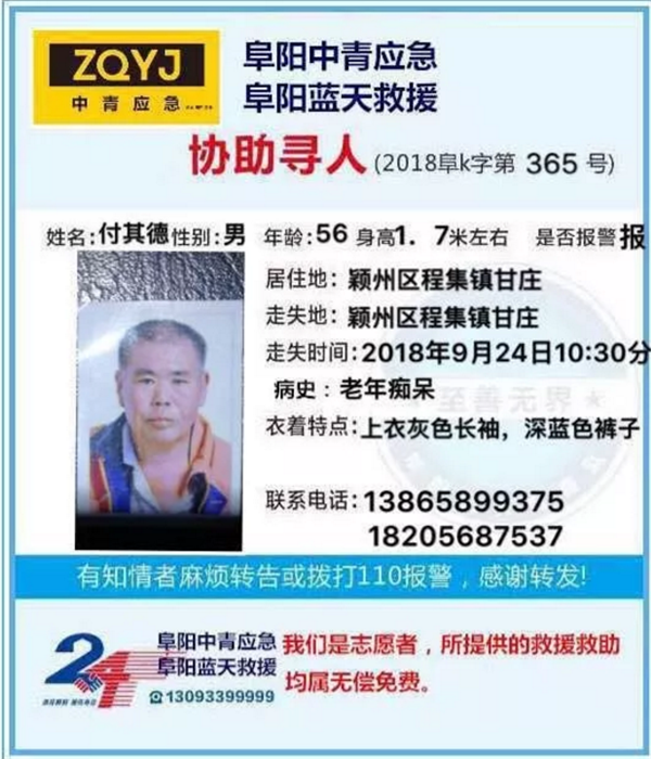 据悉浮尸被打捞上来,经确认正是三天前走失的付某,今年56岁,程集镇人。期间阜阳蓝天救援队已发出寻人启事,其家人每天也在寻找。目前,付某的死因以及相关善后事宜正在处理当中。