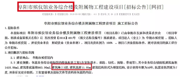 5月8日,阜阳公共资源交易中心挂出《阜阳市殡仪馆业务综合楼及附属物工程建设项目招标公告》,招标信息上显示,将新建一栋3层高的综合业务楼。