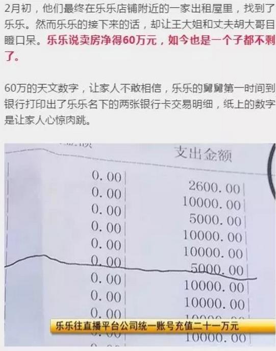 并且,每天的“打赏”都会有一个排名,而每当自己的打赏数额排到第一,乐乐的虚荣心便会得到极大的满足。去年6月份,花光积蓄的乐乐真的把名下的房产卖掉,从此走上了疯狂打赏之路。